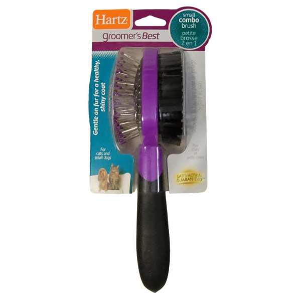 - Un lado contiene puntas de acero inoxidable con una capa protectora para eliminar el cabello suelto y desenredar la capa, el otro lado tiene densas cerdas de nylon para redistribuir los aceites naturales y lograr un pelaje brillante y saludable.