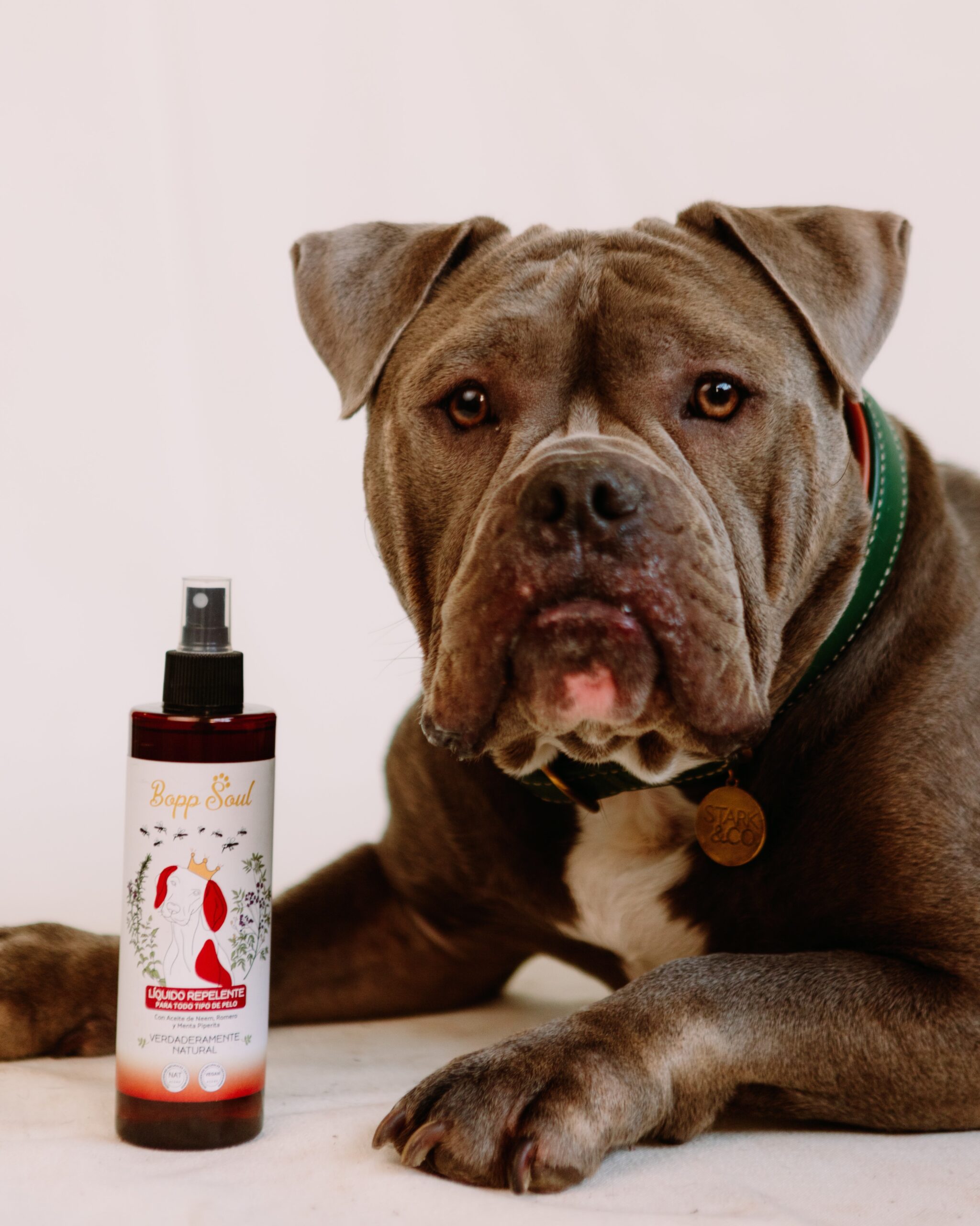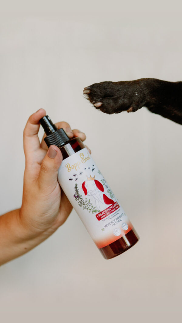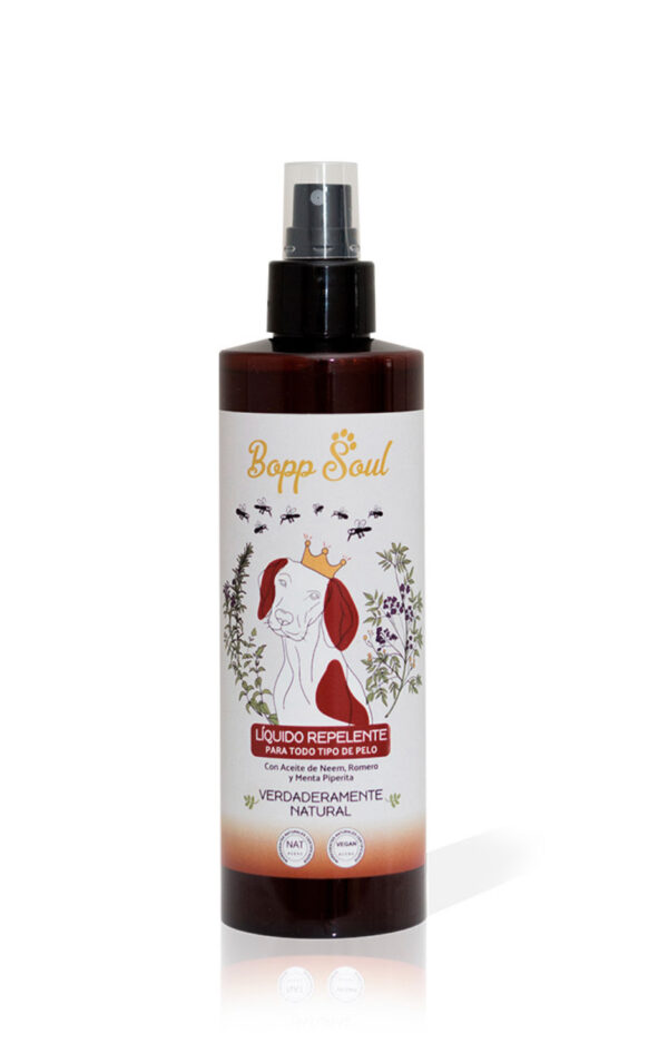 El spray repelente de Bopp Soul es altamente efectivo contra pulgas, garrapatas, mosquitos y ácaros. Contiene tres principios activos principales: